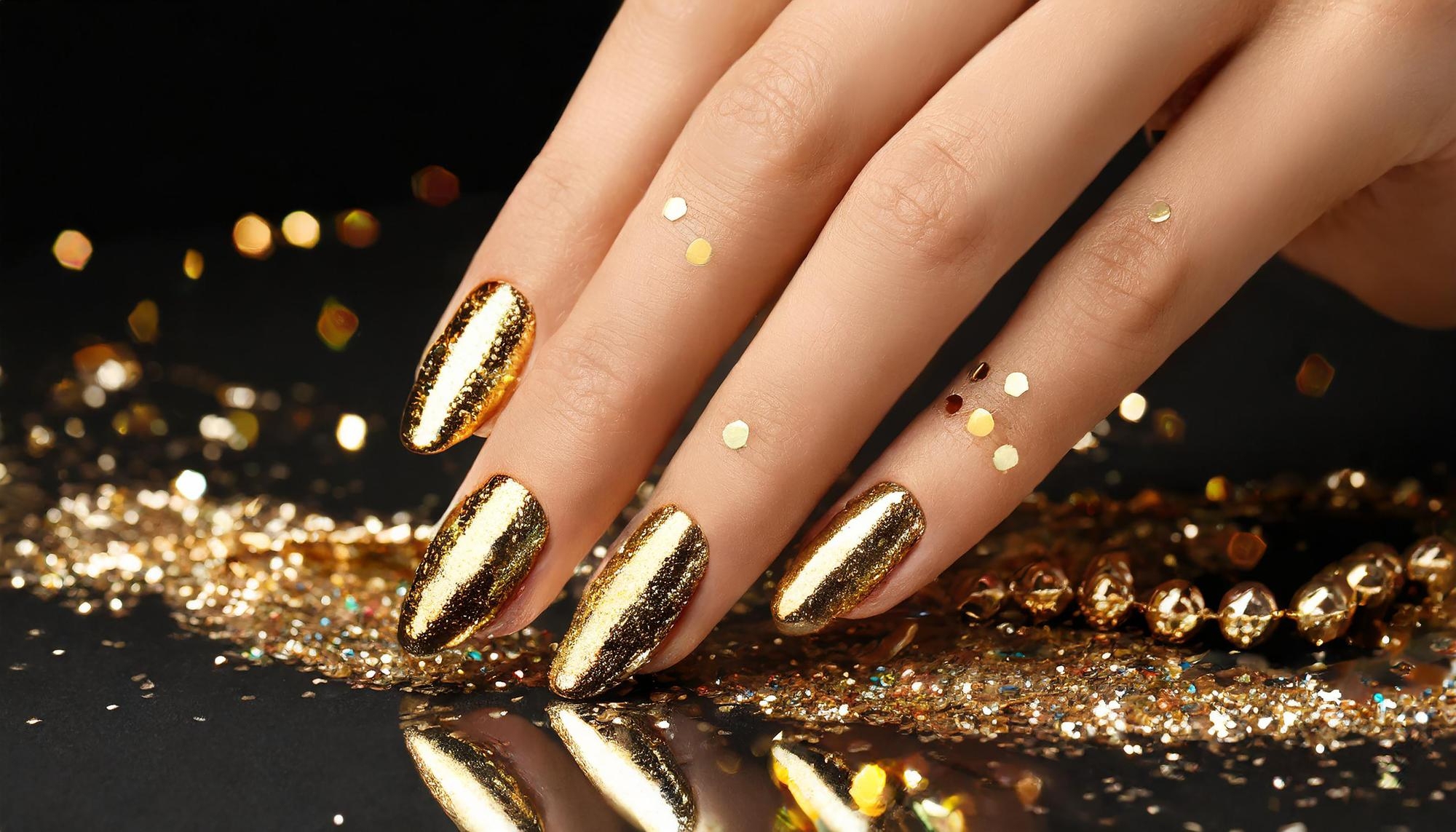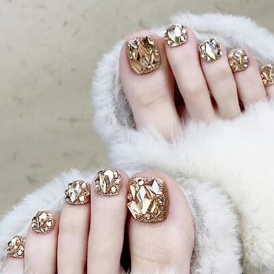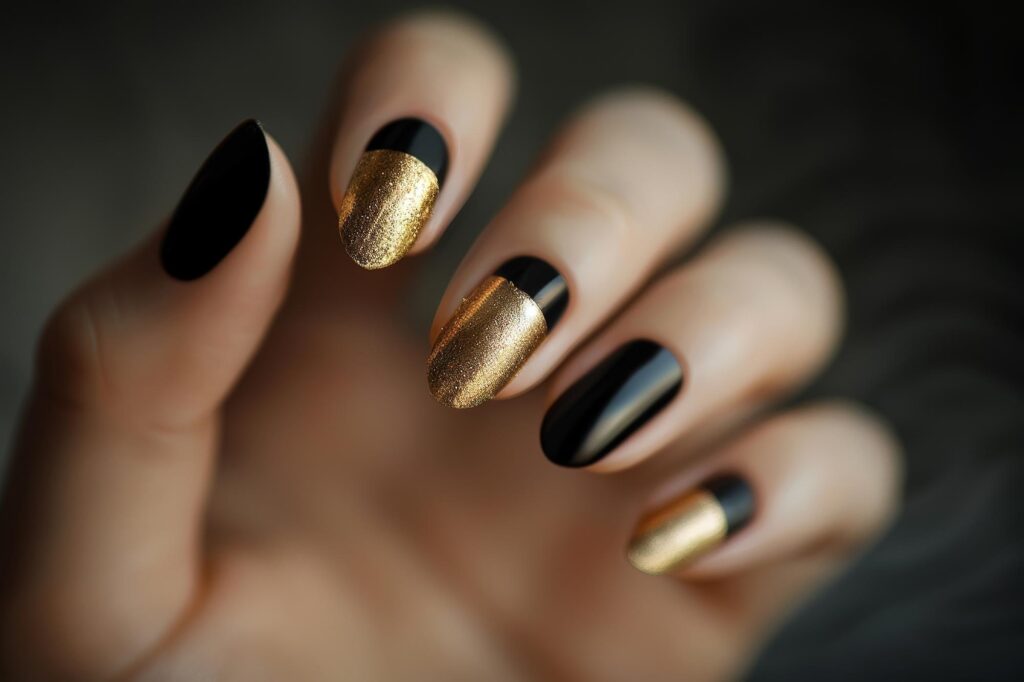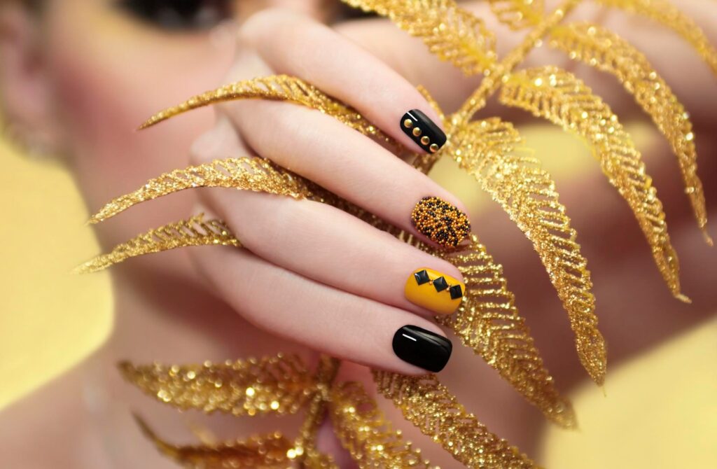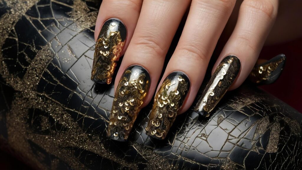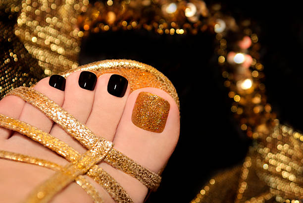 Luxury pedicure with black and gold lacquer on women’s toes on the black and brilliant background.