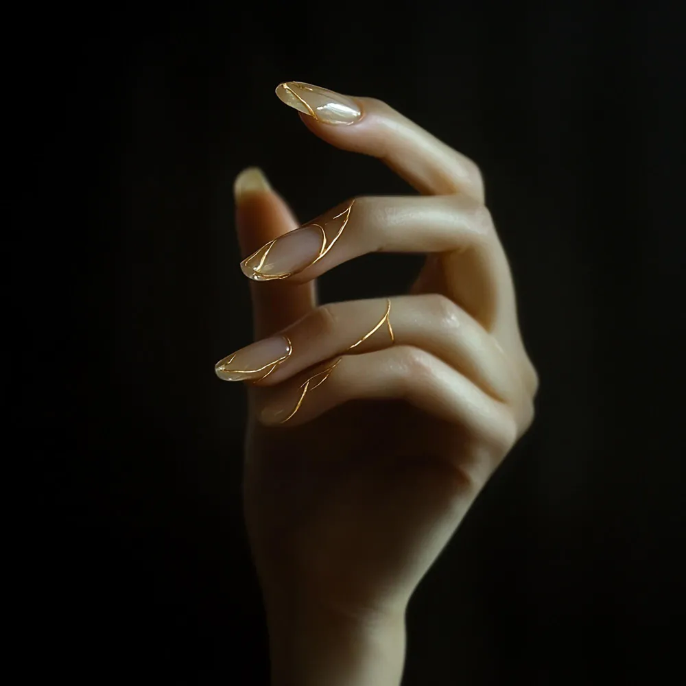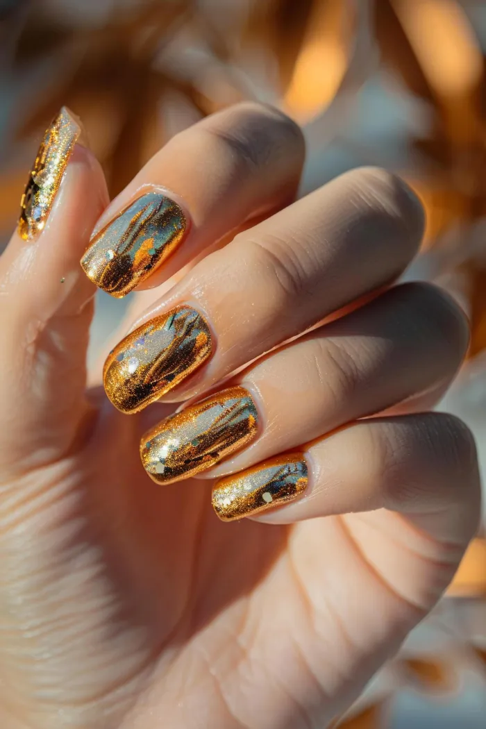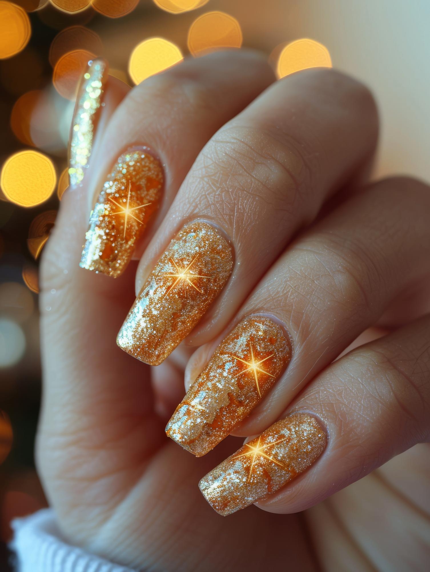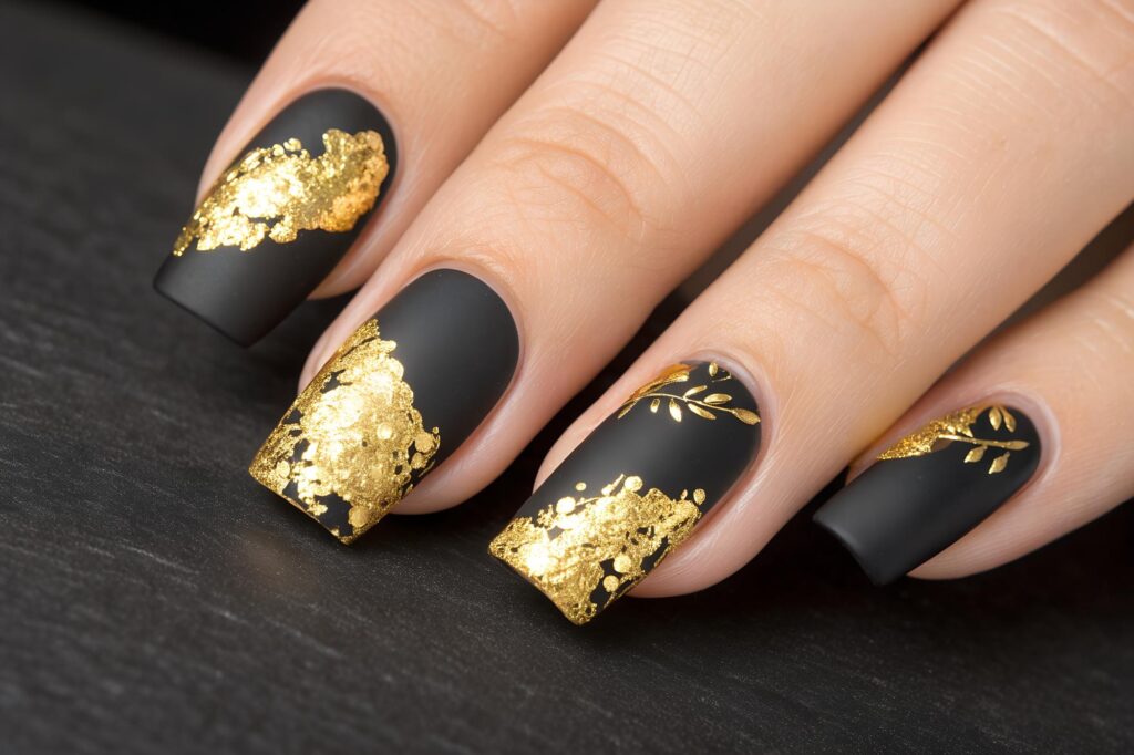 Luxury pedicure with black and gold lacquer on women’s toes on the black and brilliant background.